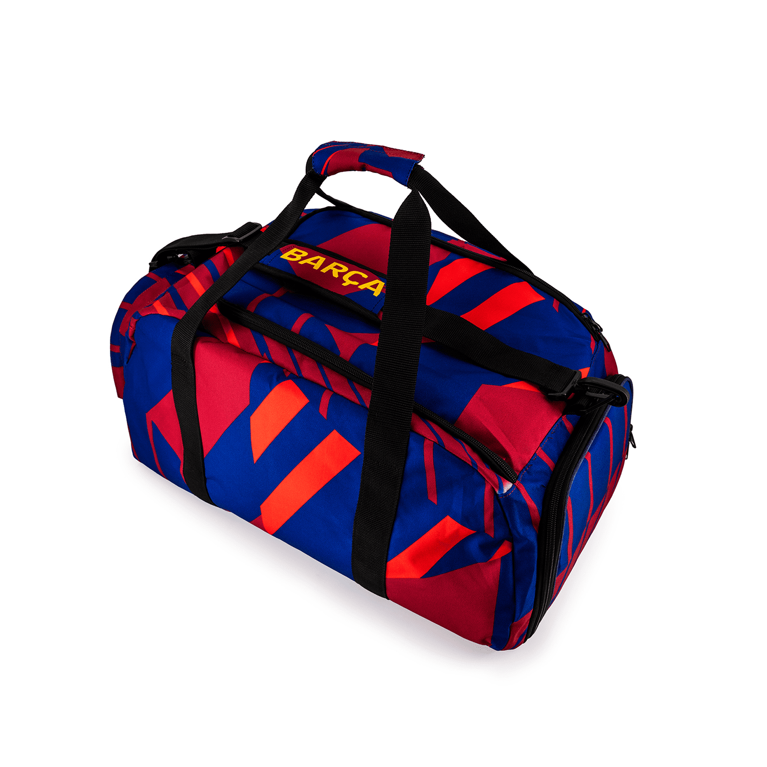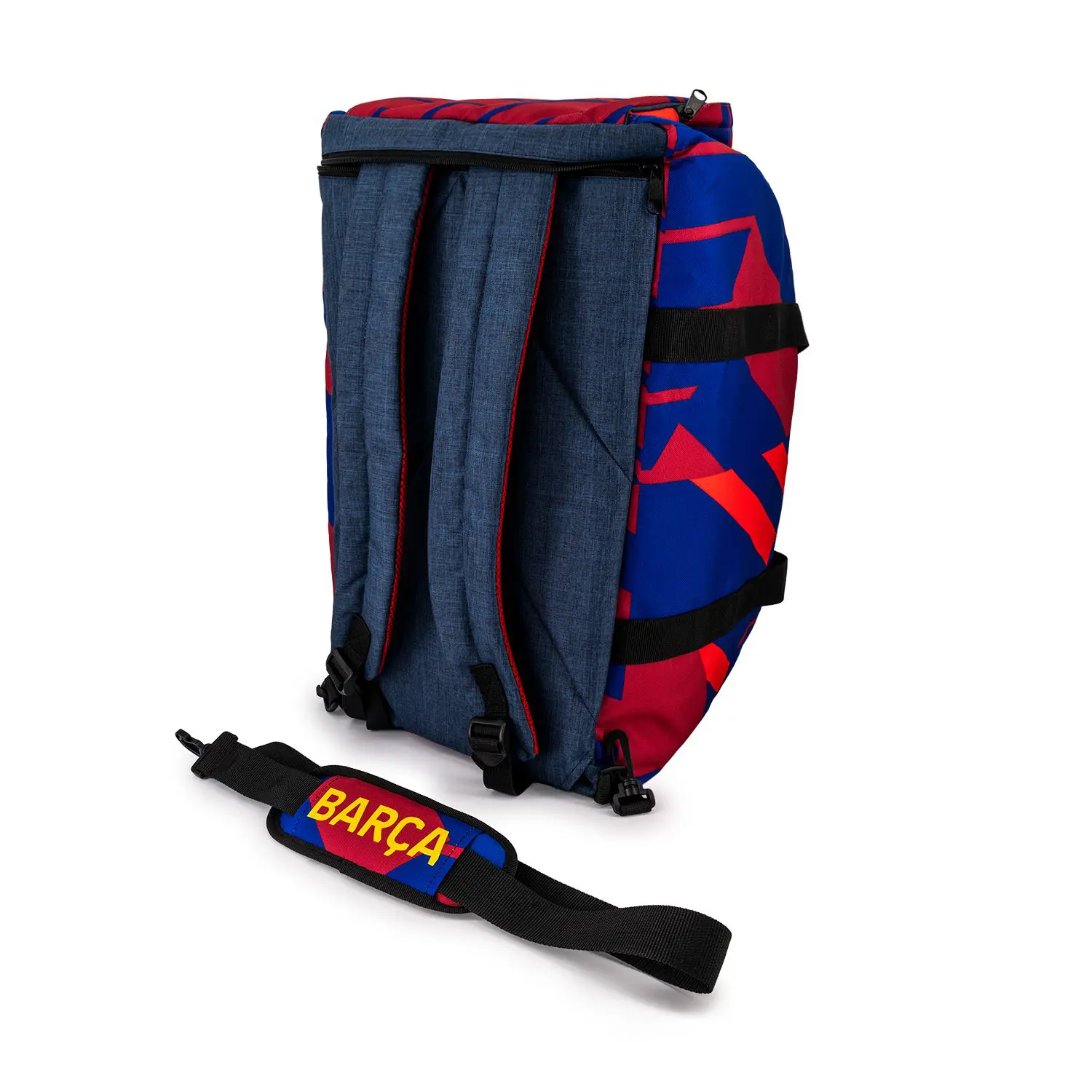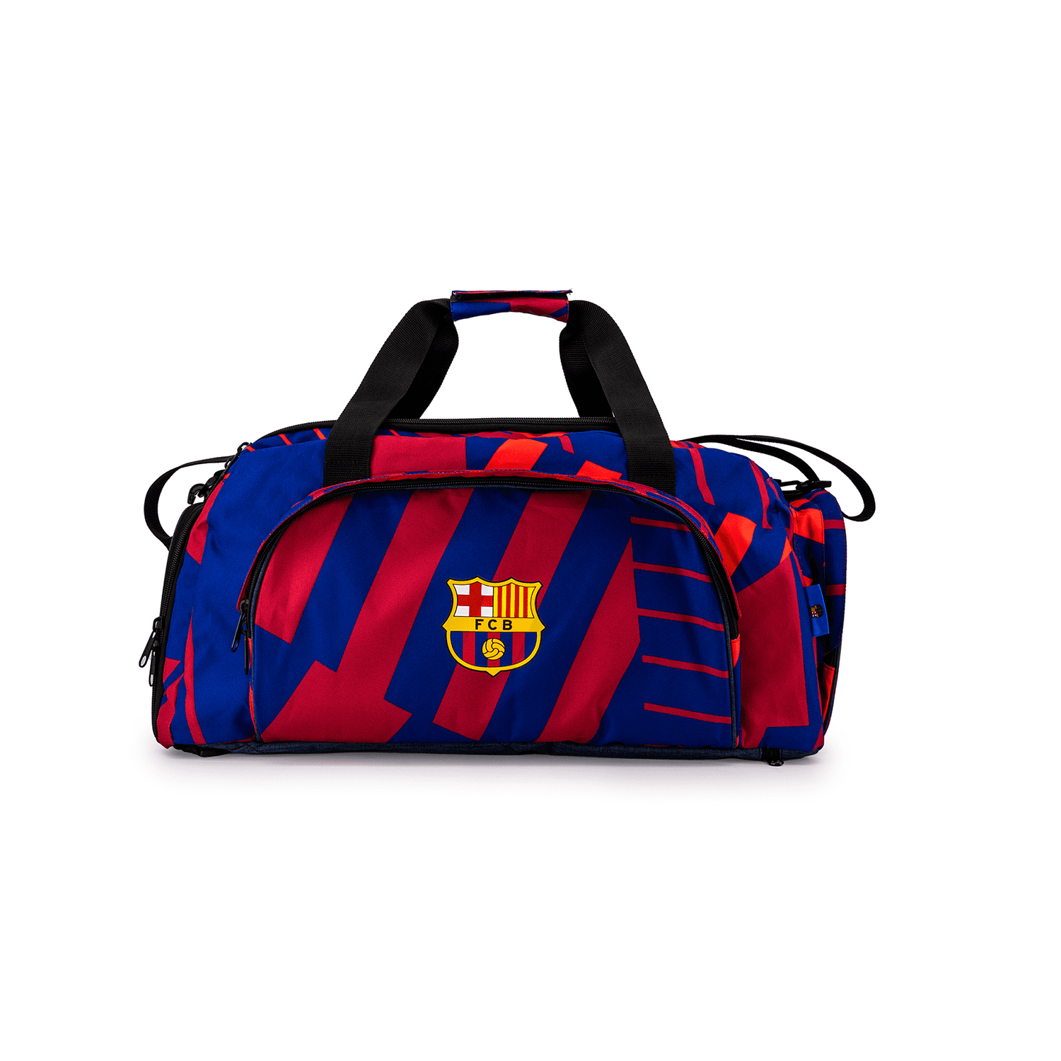 Maleta deportiva FC Barcelona con compartimento principal de gran capacidad, bolsillo organizador con cremallera, zapatera lateral y bolsillo frontal con el escudo del club. Incluye asas de mochila ajustables y correa de hombro acolchonada. Color: azul oscuro y granate Medidas: 28x51x32 cm.