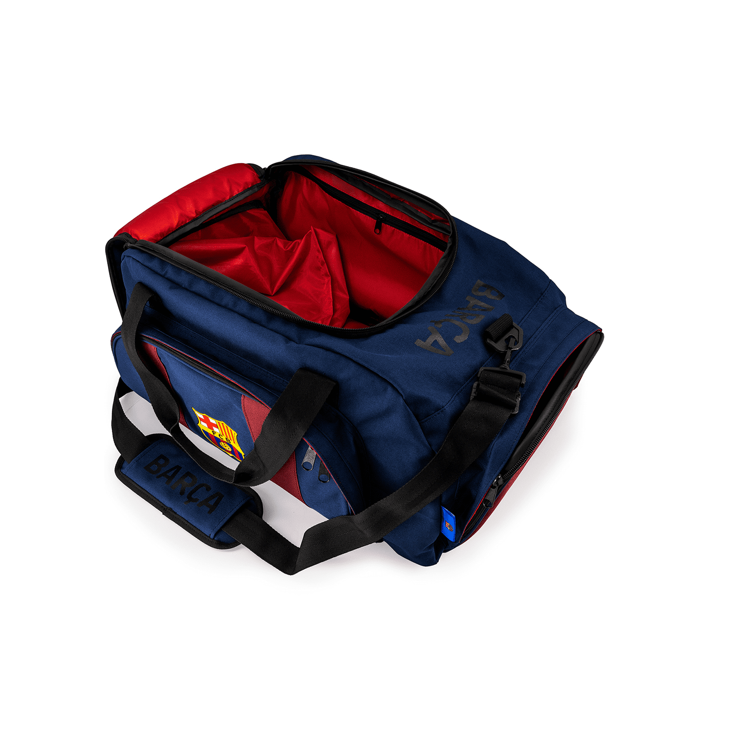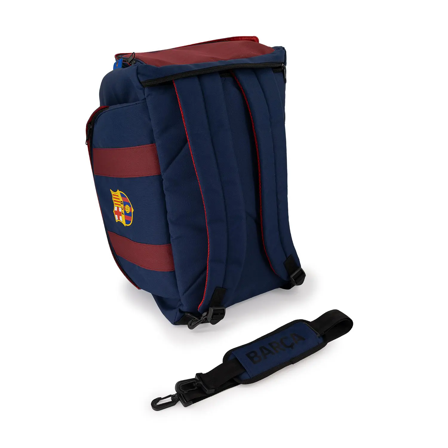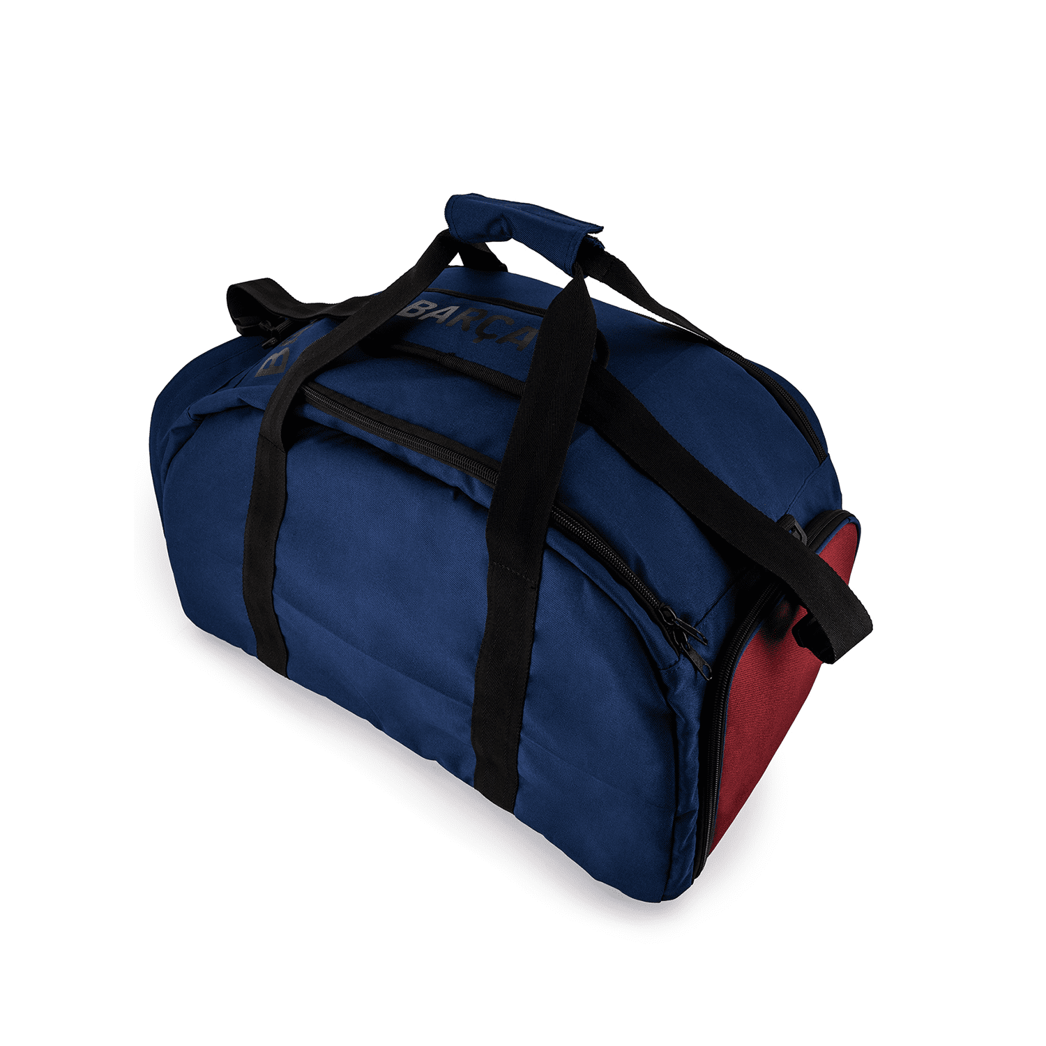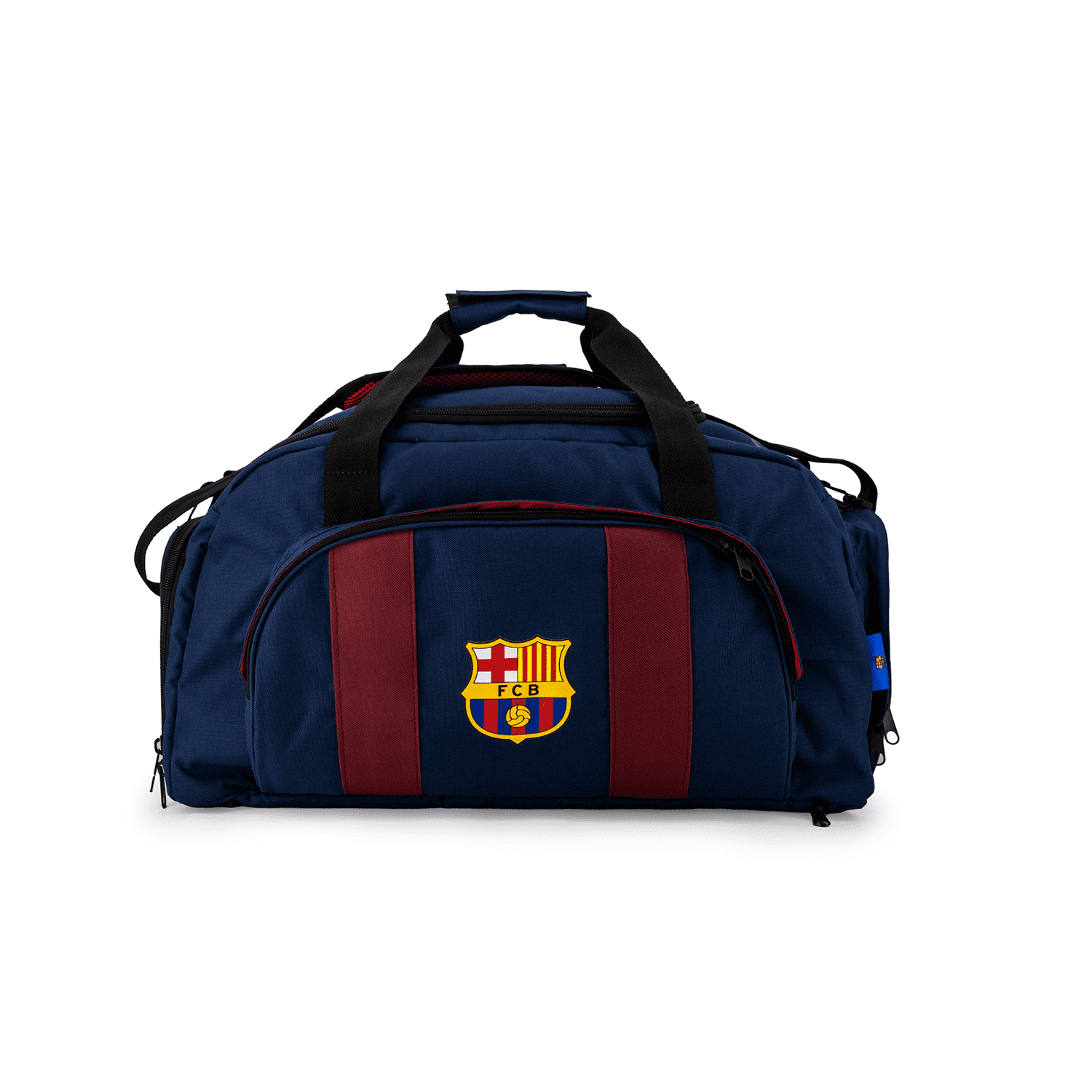 Maleta deportiva FC Barcelona con compartimento principal amplio, bolsillo organizador, zapatera lateral y bolsillo frontal con cremallera. Incluye asas de mochila ajustables, asas de mano y correa de hombro con hombrera acolchonada. Colores: azul oscuro y granate. Medidas: 28x51x32 cm.