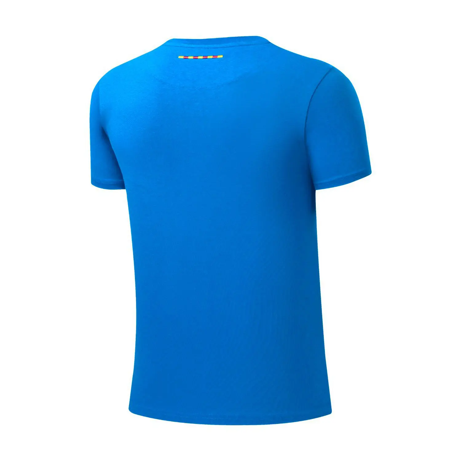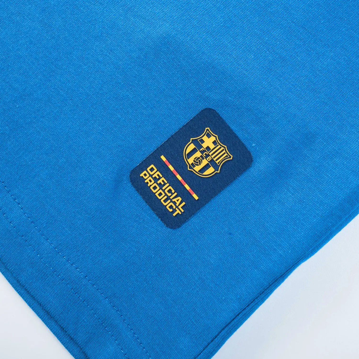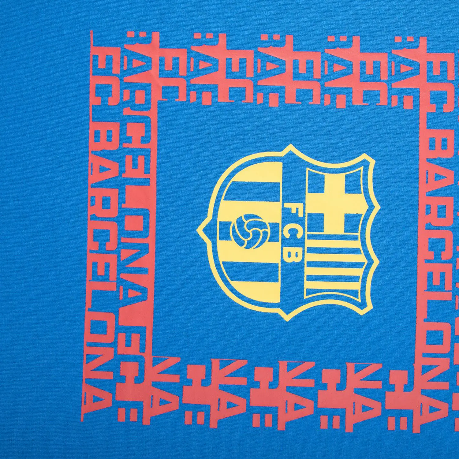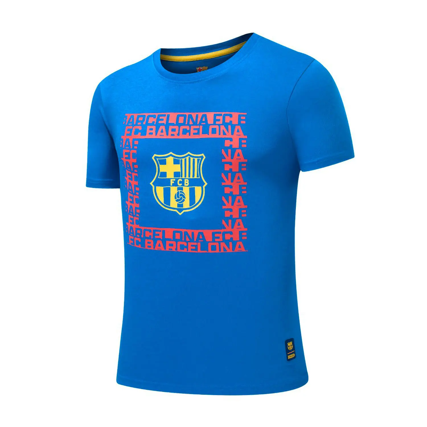 Camiseta de manga corta con escudo del FC Barcelona serigrafiado en amarillo. El escudo está encuadrado en letras rojas. Cuello redondo. Color: azul, amarillo y rojo.